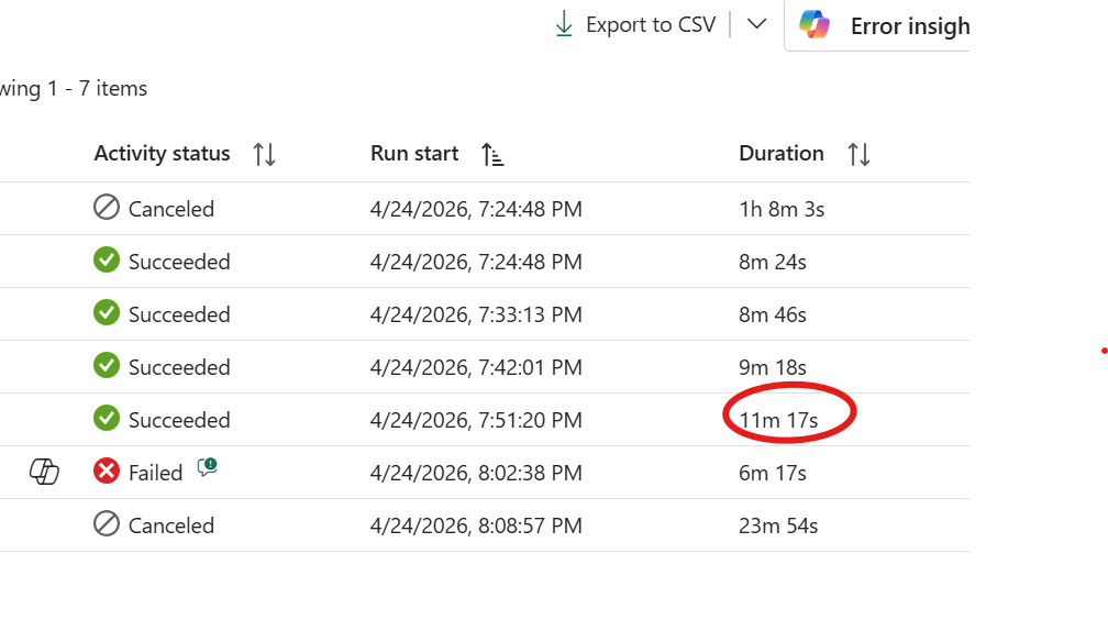 The pipeline has a 1-hour timeout. If it hangs, Fabric kills it and the next hourly run starts fresh.