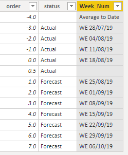 As the cut-off date change at least three times a week, the week number change accordingly, we can’t simply hard code the dates, instead let’s add a new calculated column, which will just lookup the week date from a master calendar table based on the order, when the order is -4 it will return “average to date”, I added a dummy 0.5 order just to add an empty space between actual and forecast ( cosmetic is important)