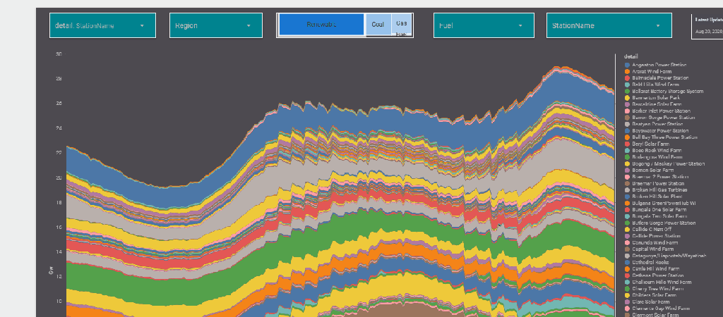 The report Show the Daily Electricity produced in eastern state of Australia, just by Using a slicer, the level of details will change to Region or Technology, or individual Generators