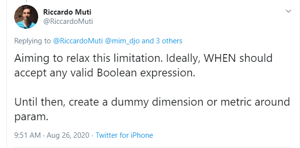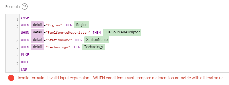 "message": "Invalid input expression. – Failed to parse CASE statement.:SELECT CASE WHEN t0.calc_5yahol5bhc = 3 THEN t0._datediff_ <= 90 WHEN t0.calc_5yahol5bhc = 6 THEN t0._datediff_ <= 180 END AS alias FROM t0;"