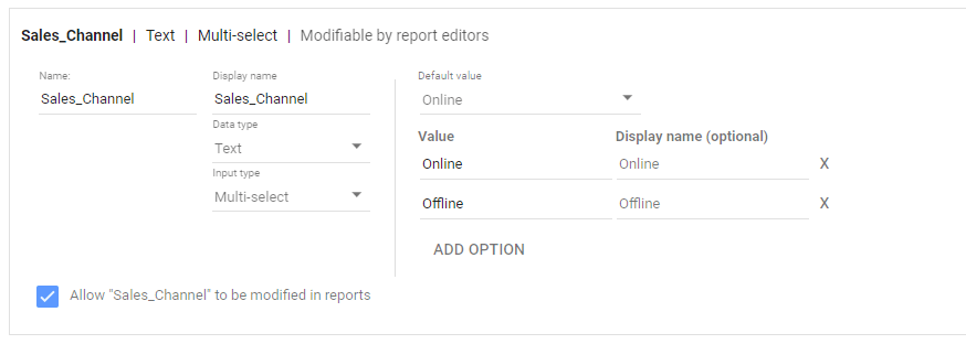 now you define the parameter ‘@Sales_Channel’, notice you have to type the values manually, for this example there are only two Values, Online/Offline