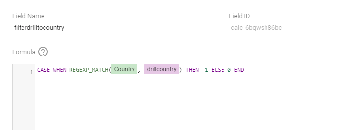 the first part is the second tab URL address , drillcountry is the parameter name as written in step 4, country is the field you are filtering on