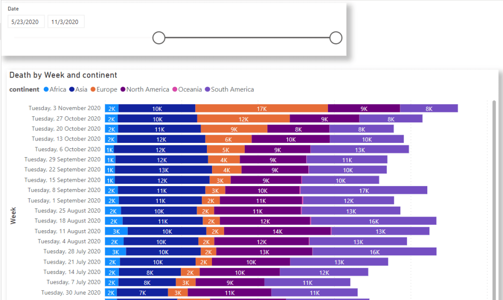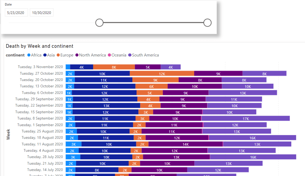 To show an example, this report show the total fatalities due to COVID19 per Week, The Cut off is 03/11/2020 which is a Tuesday, the weekly calendar is based on Tuesday as the end of the week