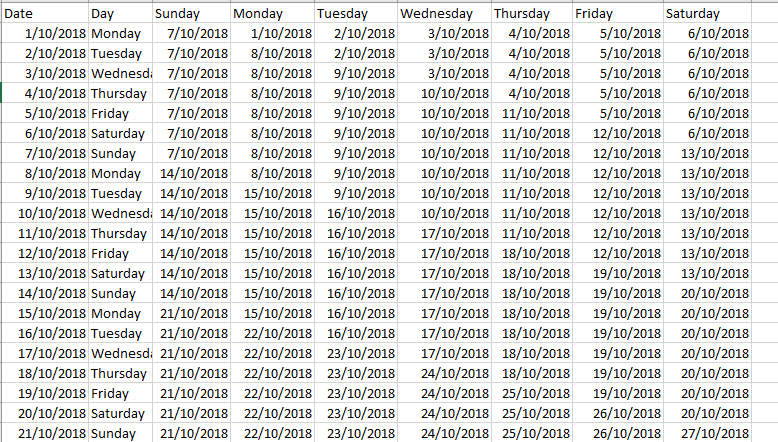 Instead I create a simple calendar table with a column Day and 7 columns with all the possible week end ( Saturday, Sunday etc)