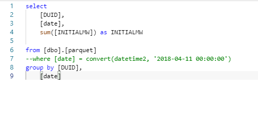 USE [test]; GO DROP VIEW IF EXISTS parquet; GO CREATE VIEW parquet AS SELECT *,convert(Datetime,result.filepath(1),120) as date FROM OPENROWSET( BULK 'https://xxxxxxxxxx.dfs.core.windows.net/parquet/nem.parquet/Date=*/*.parquet', FORMAT='PARQUET' ) result