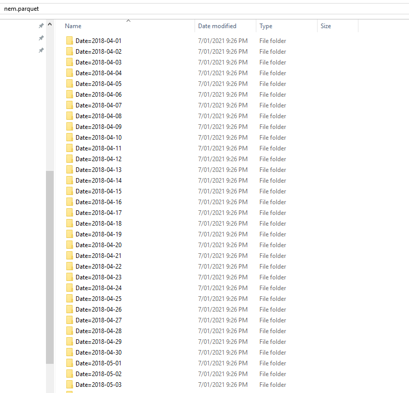 df.to_parquet('nem.parquet',partition_cols=['Date'],allow_truncated_timestamps=True)