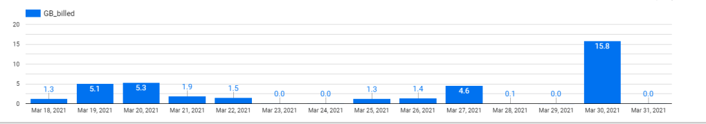 Personally I am very interested in Case 4, obviously if I reserve a Memory I want to minimize scanned storage to the lowest possible, here is the result for the last 10 days, I think that’s a great result, my ” Big Table is 6 GB, 50 Million rows” other tables are smaller , the dev team said they are working on improving even more how BI Engine algorithm deals with smaller tables, so far happy with that. ( it is fixed now, the memory consumption is extremely low now )