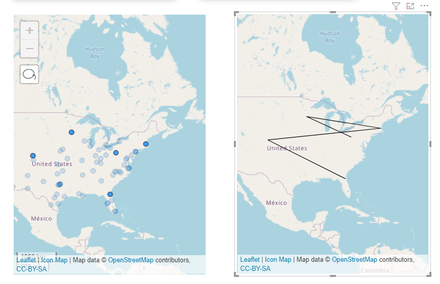 and Voila now you have two Map, The Point Selected in the first Map will be shown as a line in the second Map, CONCATENATEX does not respect the Order of Selection, so currently it is useful only for two Points ( M parameter respect the selection but that will be another Blog)