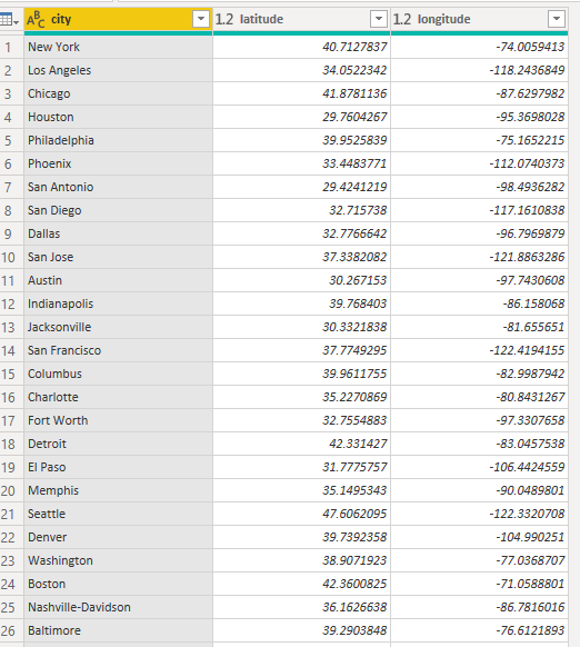Target_Lat = LOOKUPVALUE(reference[latitude],reference[city],min(Target[Target City])) Target_Lng = LOOKUPVALUE(reference[longitude],reference[city],min(Target[Target City]))