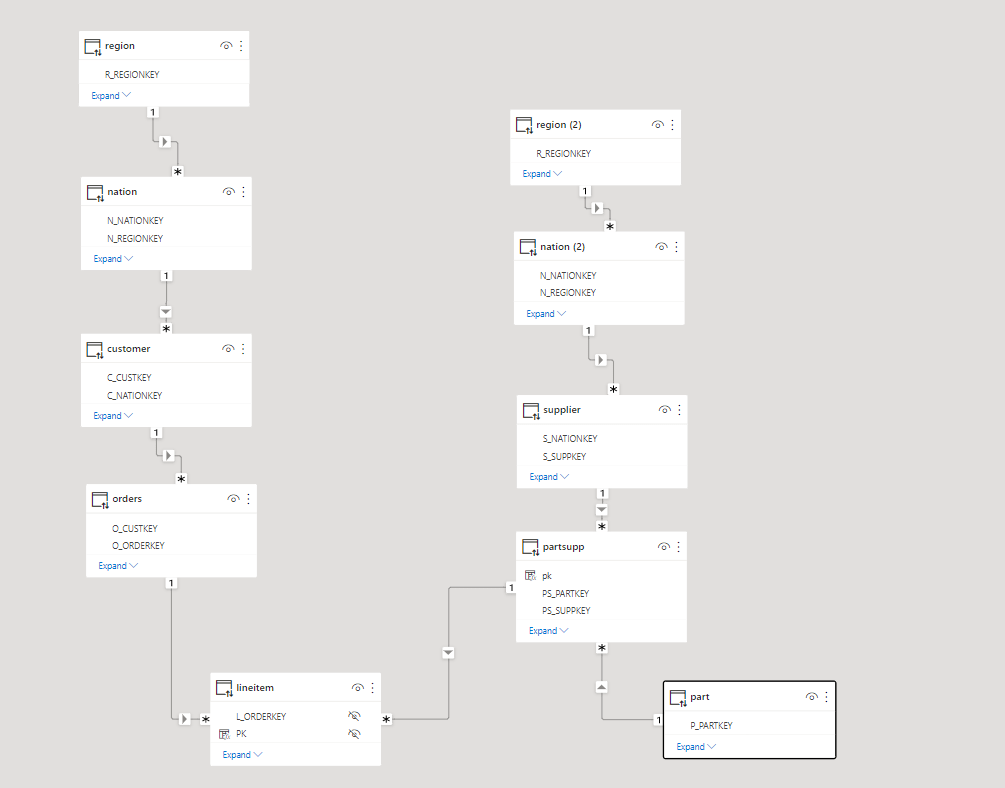 In this particular case I am using TPC-H Data Model as an example, although it is very useful for benchmark, it is not really optimized for a BI Workload, joins are expensive.