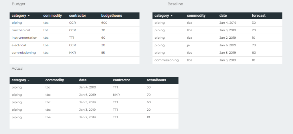 we have three Tables, Budget, Actual and Baseline, the common field is Category and commodity