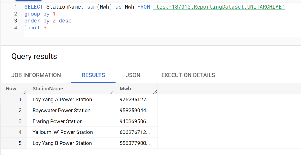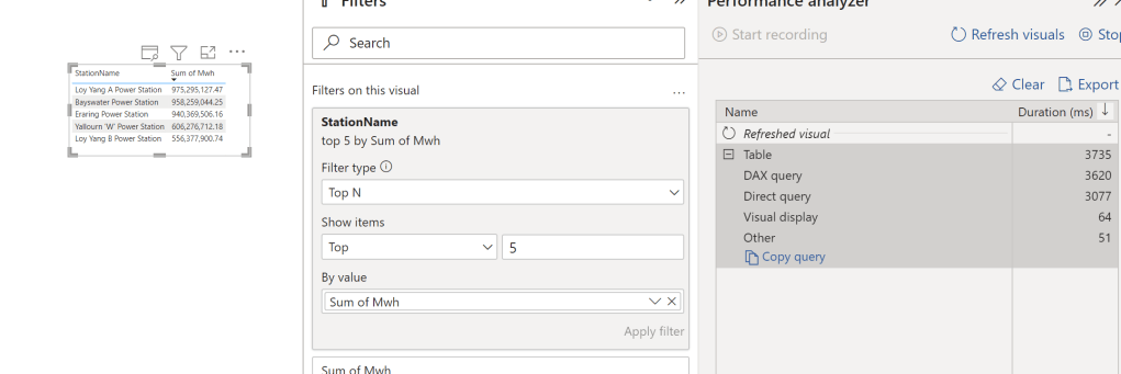 let’s try with one table in BigQuery as an example, and ask this Question, what’s the top 5 Substation by Electricity produced, in PowerBI, it is a trivial exercise, just use the Top N filter