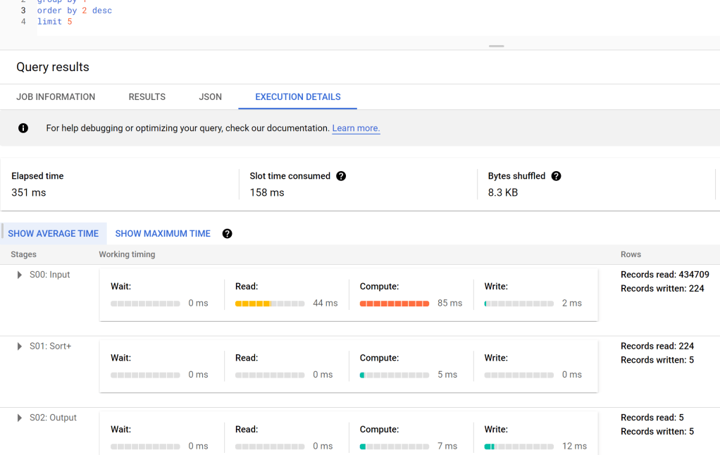 And let’s check the duration, 351 ms, the table has 91 Million records, that’s not bad at all, but we need to account for the data transfer latency to my laptop, still that does not explain the difference in duration !!!