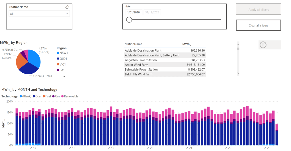 In this report, which show analyze Electricity production for the Australian Market, the base table is sorted by day, that make perfect sense as most uses will want to see only a specific time period then aggregate by some attribute like region, technology etc