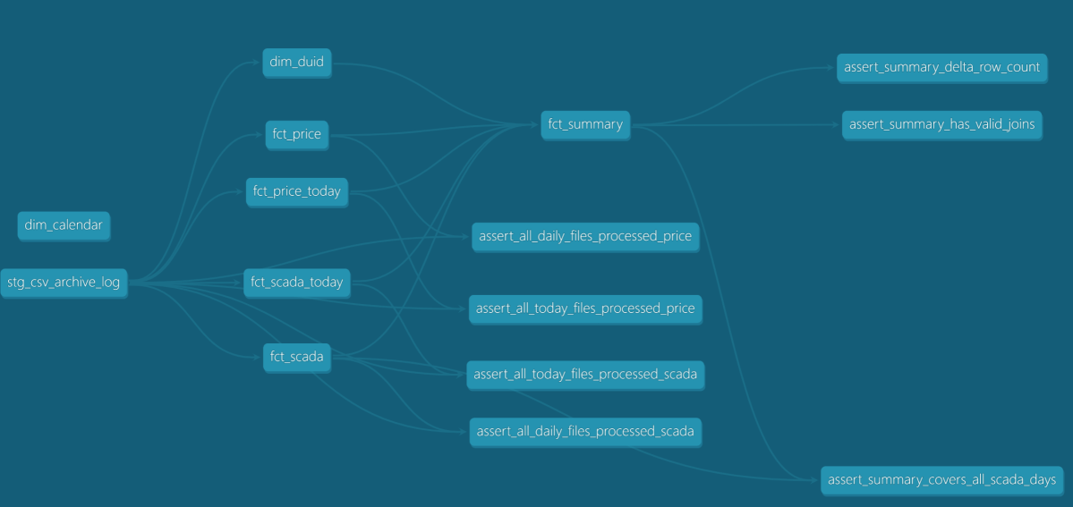 - 3 tables exposed to Power BI: dim_calendar, dim_duid, fct_summary