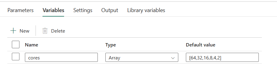 Set up a pipeline variable cores of type Array with a default value of [64,32,16,8,4,2]: