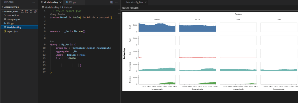 DuckDB queries were run using Visual studio notebook, I would had prefered Malloy but it does not support native DuckDB storage format yet , you can download the python files here and how to create the DB and Tables
